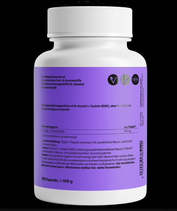 750mg de N-acetil L-Cisteína pura por cápsula vegana. Apto para veganos.